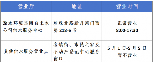 ?依據(jù)國務(wù)院辦公廳《關(guān)于2025年部分節(jié)假日安排的通知》,結(jié)合供水服務(wù)工作的實(shí)際情況,勞動(dòng)節(jié)期間溧水環(huán)境集團(tuán)自來水公司各供水服務(wù)營業(yè)點(diǎn)放假安排如下: